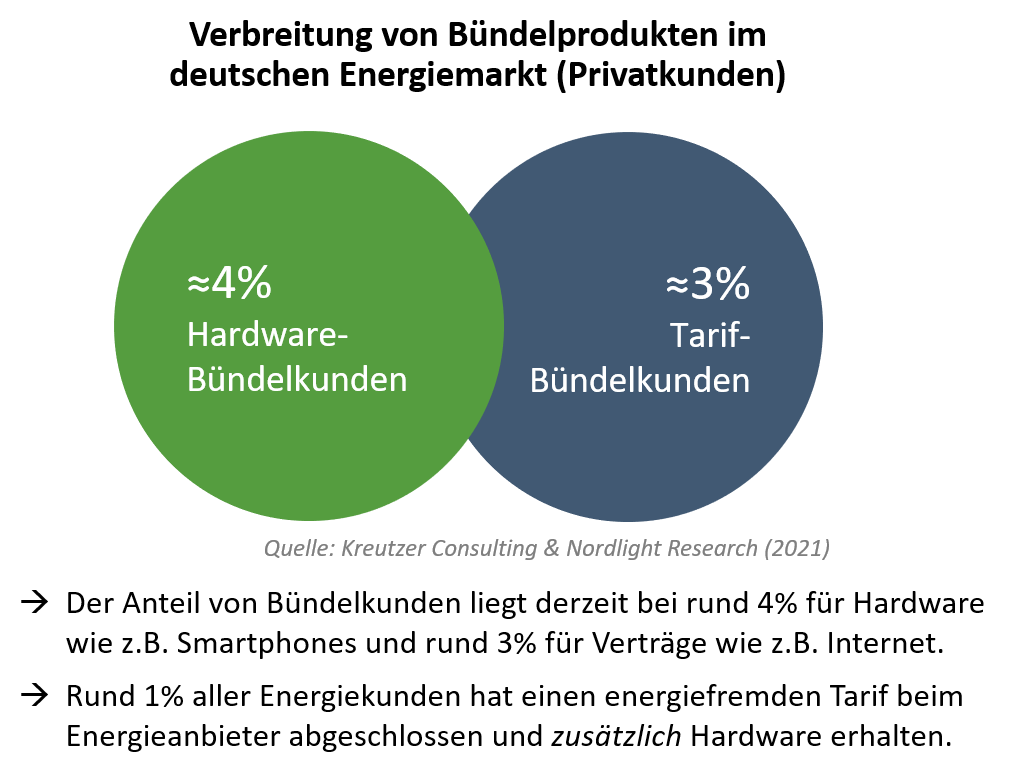 Im hart umkämpften Strom- und Gasgeschäft gelten Bündelprodukte als spannende Option, um sich von den Wettbewerbern abzuheben, werthaltige Neukunden zu gewinnen und die Kundenhaltedauer zu erhöhen. Bisher ist die Marktdurchdringung mit solchen Kombi-Angeboten aber sehr gering. Nur rund 4 Prozent der Energiekunden beziehen derzeit ein Bündel aus Energievertrag und Hardwareprodukt, während rund 3 Prozent ein Bündel aus Energie und einem weiteren Tarif wie z.B. Internet in Anspruch nehmen. Dies geht aus Befragungen von knapp 12.000 Verbrauchern hervor, die im Rahmen der Vertriebskanalstudie Energie sowie der im April 2021 erstmals erschienenen Bündelproduktstudie Energie von Kreutzer Consulting und Nordlight Research durchgeführt wurden.