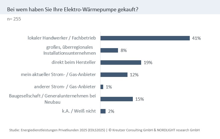 Der Marktanteil von Energieanbietern liegt bei Elektro-Wärmepumpen bei rund 13 %, während etwas mehr als zwei Drittel ihre Wärmepumpe beim lokalen Handwerker (41 %), überregionalen Installationsbetrieb (8 %) oder direkt beim Hersteller (19 %) gekauft haben. Dies geht aus der in Kürze erscheinenden Studie „Energiedienstleistungen für Privatkunden 2025“ von Kreutzer Consulting und Nordlight Research hervor.