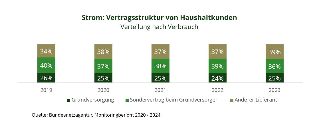 Seit 2019 ist ein kontinuierlicher Rückgang des Marktanteils von Sonderverträgen bei Grundversorgern (nach Verbrauch) erkennbar. Im Vergleich zu 2022 ist 2023 ein Rückgang um drei Prozentpunkte zu beobachten. Seit 2019 ist die Quote um 10 % gesunken. Der Anteil grundversorgter Kunden ist hingegen seit 2019 weitgehendst stabil geblieben.