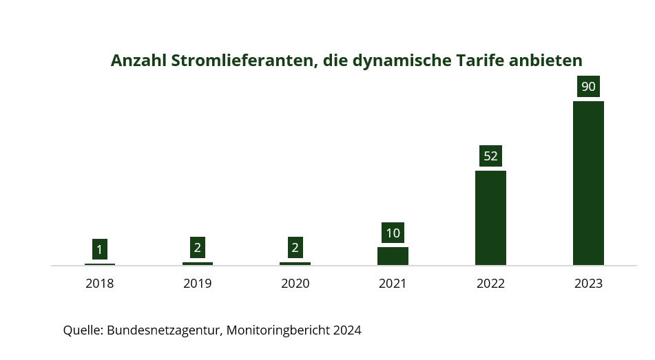 Auch die Einführung dynamischer Tarife ist in der Vergangenheit, wenn auch sprunghaft, insgesamt eher schleppend verlaufen. Setzt man 90 Stromlieferanten mit dynamischen Tarifen mit etwa 1.400 Stromanbietern auf Bundesebene in Relation, entspricht die Quote gerade einmal in etwa 6 %.