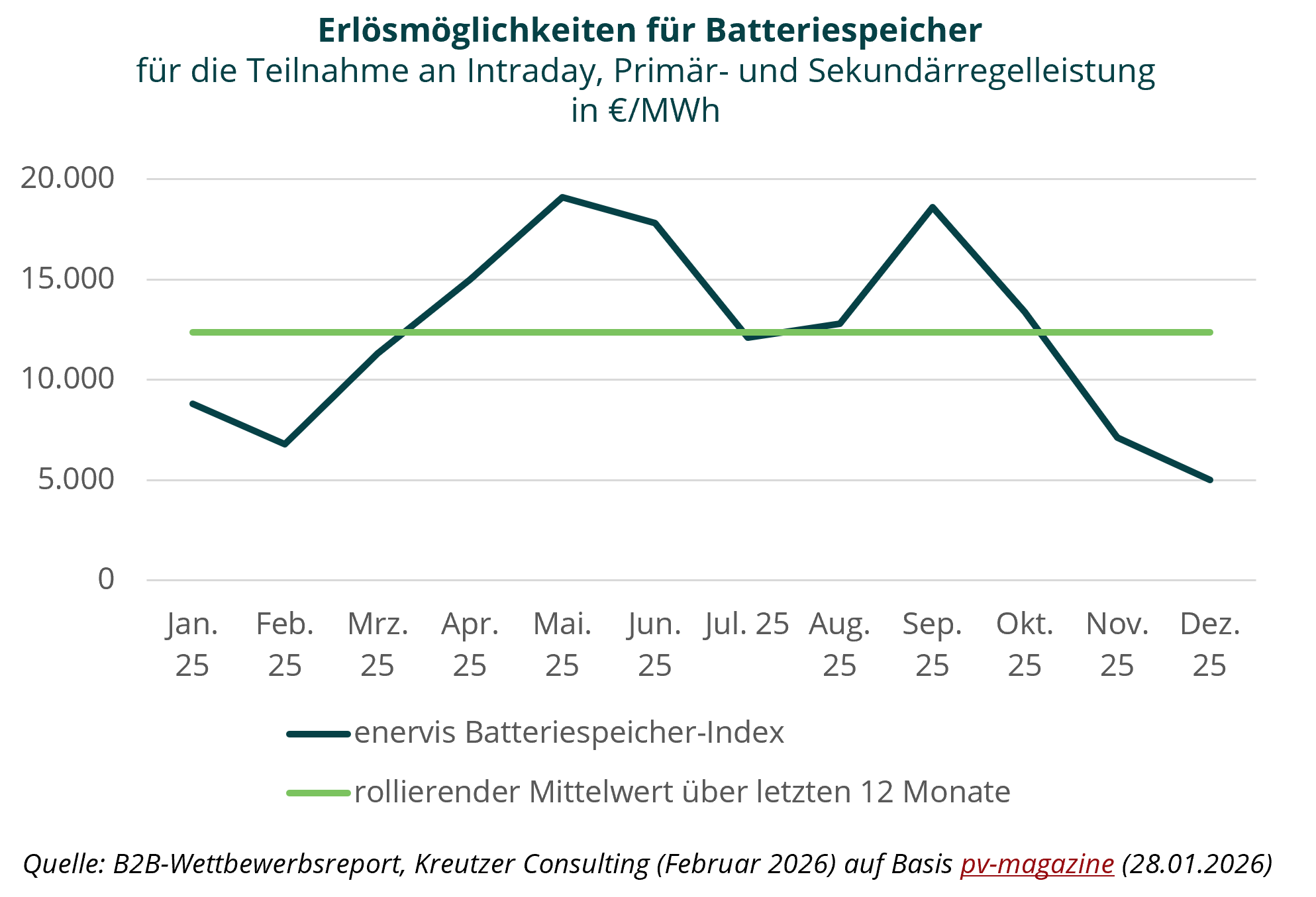 Batteriespeicher sind bisher vor allem in den klassischen Regelenergiemärkten aktiv. In 2025 ergab sich für Batteriespeicher für die Teilnahme an Intraday, Primär- und Sekundärregelleistung ein durchschnittliches monatliches Erlösniveau von rund 12.370 €/MWh, was einem Jahreswert von etwa 148.500 €/MWh entspricht. Die monatlich erzielbaren Erlöse schwankten dabei im Jahresverlauf 2025 deutlich.