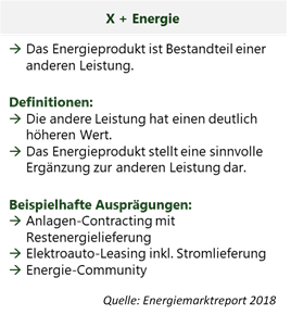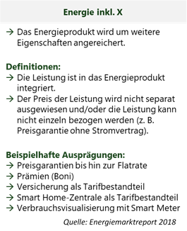 Seit der Energievertrieb liberalisiert und aufgrund zahlreicher Tarifvergleichsmöglichkeiten im Internet transparent ist, beinhalten Energietarife zur Differenzierung Qualitätsmerkmale wie etwa Geldboni, Preisgarantien oder ein Ökostrom-Label. Auch die Nutzung einer Smart Home-Zentrale, eines Smart Meter oder bspw. ein Haushaltsschutzbrief können Bestandteile sein. Dieses Produktkonzept kann als „Energie inkl. X“ definiert werden. Die Energielieferung steht im Mittelpunkt, Zusatzleistungen werden in den Tarif voll integriert. Die Leistung kann meist nicht separat bezogen werden. Über die gängigen Qualitätsmerkmale hinausgehende Leistungen können die Wertigkeit von Energietarifen durchaus steigern, sofern die kombinierten Leistungen dem Kunden auch einen Zusatznutzen bieten.