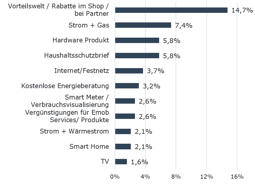 Welche Arten von Bündelprodukten bzw. Zusatzleistungen im Moment angeboten werden, geht u.a. aus einer Untersuchung der Webseiten von 190 Versorgern aller Anbieterkategorien hervor, die im Januar im Rahmen der Bündelproduktstudie vorgenommen wurde. Vergleichsweise oft werden noch Rabattprogramme bzw. eine „Vorteilswelt“ angeboten, wobei hier meist Rabatte auf Produkte und Leistungen von kooperierenden Drittanbietern eingeräumt werden.