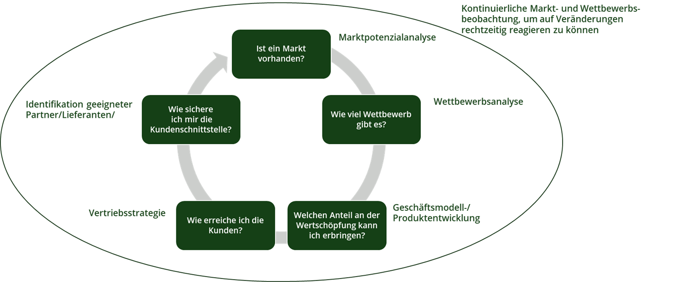Die Ausweitung des Angebots oder gar der Einstieg in vollkommen neue Geschäftsfelder sind jedoch mit Risiken verbunden, die durch eine gute Vorbereitung unter Berücksichtigung der aktuellen und künftigen Rahmenbedingungen minimiert werden können. Neben den generellen Fragen zum Marktpotenzial, der Wettbewerbsentwicklung und der sonstigen Rahmenbedingungen, geht es vor allem darum, ein Geschäftsmodell zu wählen, bei dem man selbst die Kundenschnittstelle besetzt. Die folgenden Punkte zeigen, welche zentralen Aspekte unter anderem betrachtet werden müssen.
