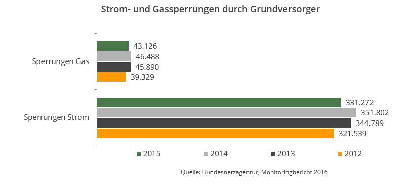 Laut dem Monitoringbericht der Bundesnetzagentur ist die Zahl der tatsächlich durchgeführten Sperrungen der Energielieferung durch die Grundversorger bei Strom und Gas im Jahr 2015 zurückgegangen. Bei Strom beträgt der Rückgang bei 331.272 Sperrungen im Vergleich zum Rekordjahr 2014 knapp sechs Prozent. Einen ähnlich hohen Rückgang verzeichnet die Behörde auch bei Gas mit 43.126 Sperrungen.
