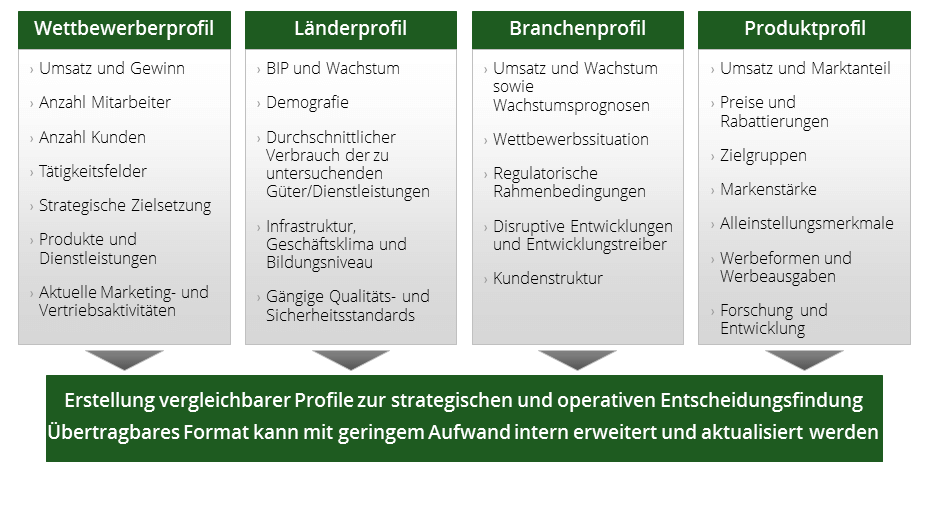 Markt und Wettbewerbsprofile bieten entscheidungskritische Informationen in kompakter und schnell verständlicher Form. Sie erhöhen die Vergleichbarkeit diverser Beobachtungsgegenstände und müssen nach der einmaligen Erstellung in Zukunft nur noch aktualisiert werden.